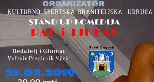 Poštovani, Slobodni smo Vam ponuditi ulaznice za stand-up komediju pod nazivom Rat i ljubav u produkciji Kulturno športske braniteljske udruge. Ova stand-up komedija bit će izvedena u ponedjeljak, 25. veljače 2019. u 20 sati u Centru za kulturu Trešnjevka. O predstavi: Stand-up komedija donosi niz imitacija i komentara na temu …