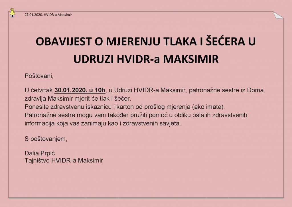 Home / Obavijesi za članove / Obavijest o mjerenju šećera i tlaka
