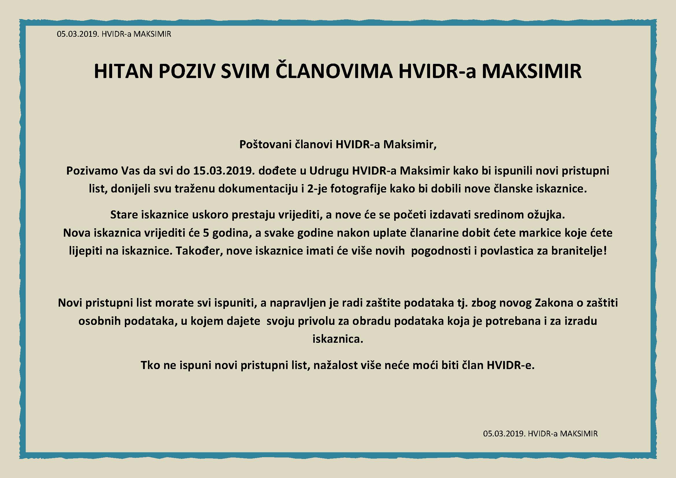 HITAN POZIV SVIM ČLANOVIMA HVIDR-a MAKSIMIR