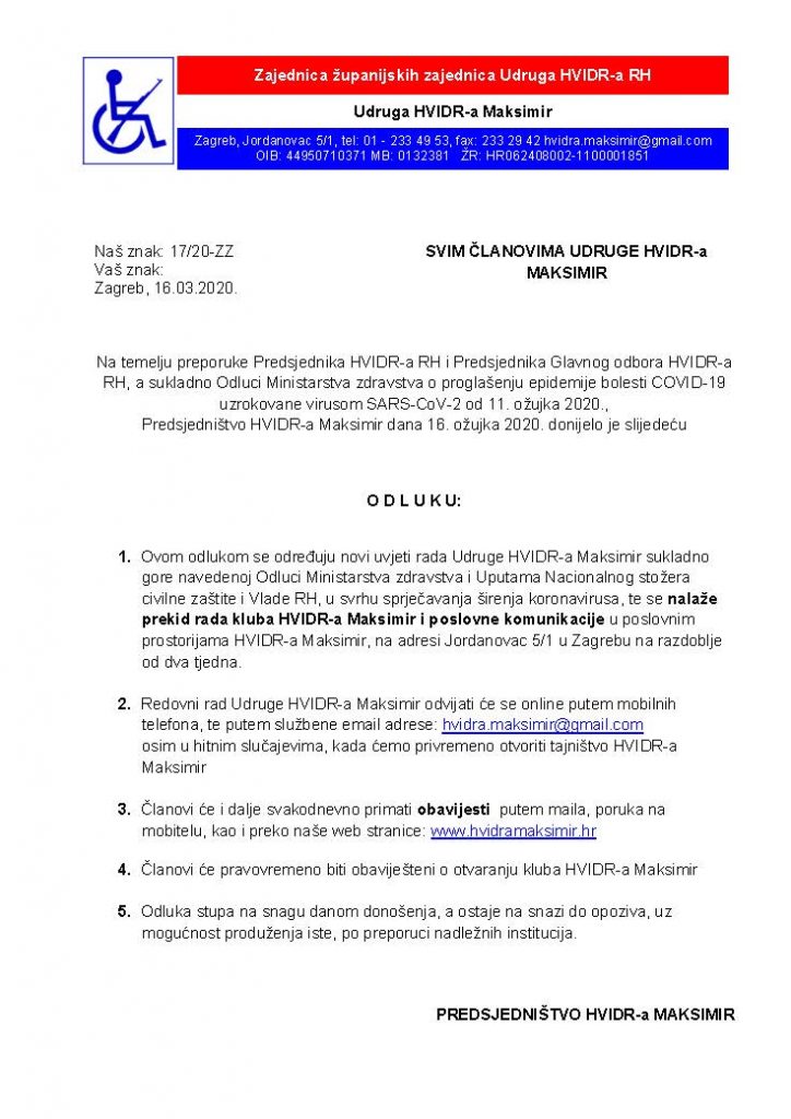 Home / Obavijesi za članove / ODLUKA PREDSJEDNIŠTVA HVIDR-a MAKSIMIR
