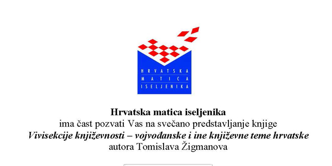 Hrvatska matica iseljenika ima čast pozvati Vas na svečano predstavljanje knjige Vivisekcije književnosti – vojvođanske i ine književne teme hrvatske autora Tomislava Žigmanova u utorak iza Uskrsa 23. travnja 2019. s početkom u 13 sati  koje će se održati u Hrvatskoj matici iseljenika, Trg Stjepana Radića 3, Zagreb.