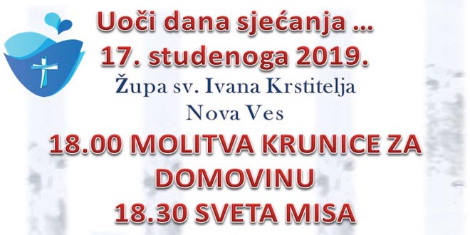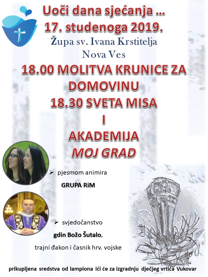 U ime župljana župe sv. Ivana Krstitelja u Novoj Vesi (Nova Ves 64A, Zagreb) i svoje ime čast nam je pozvati Vas na prvi ovakav susret u Našoj župi. Uoči dana sjećanja na žrtvu Vukovara koji je simbol stradanja ali i na ostale ratom pogođene krajeve prelijepe nam domovine Hrvatske, sjećanja na poginule hrvatske branitelje i civile, na nestale, ranjene i sve članove njihovih obitelji 17. studenoga u župi sv. Ivana Krstitelja krunicom za domovinu koja započinje u 18 sati, svetom Misom u 18.30 sati i svečanom akademijom u molitvi, prisjećanju, zahvalnosti stavit ćemo sve naše zajedničke nakane pred Gospu i Gospodina.