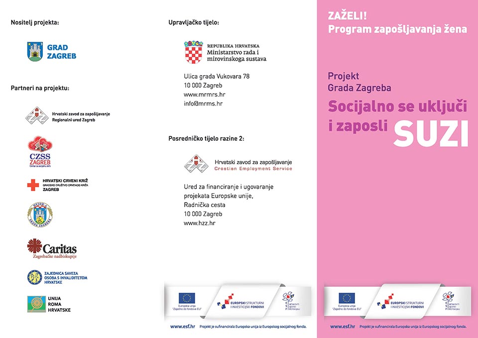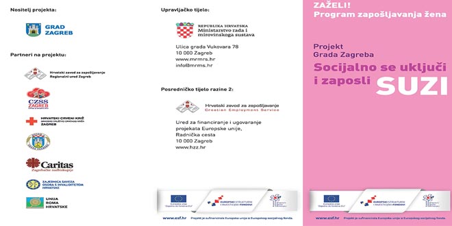 Obavještavamo Vas da će Grad Zagreb provesti Projekt ZAŽELI – program zapošljavanja žena, pod nazivom „Socijalno se uključi i zaposli- SUZI“, u kojem sudjeluje Gradski ured za branitelje, a financiran je iz Europskog socijalnog fonda, Operativni program Učinkoviti ljudski potencijali 2014.-2020.