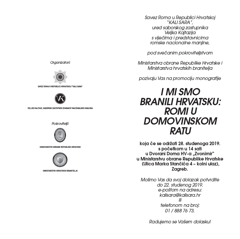 pozivamo Vas na promociju monografije “I mi smo branili Hrvatsku: Romi u Domovinskom ratu” u četvrtak, 28. studenoga 2019. godine u 14 sati u Dvorani Doma HV-a “Zvonimir” (Ministarstvo obrane Republike Hrvatske, Ulica Marka Stančića 4, kolni ulaz).