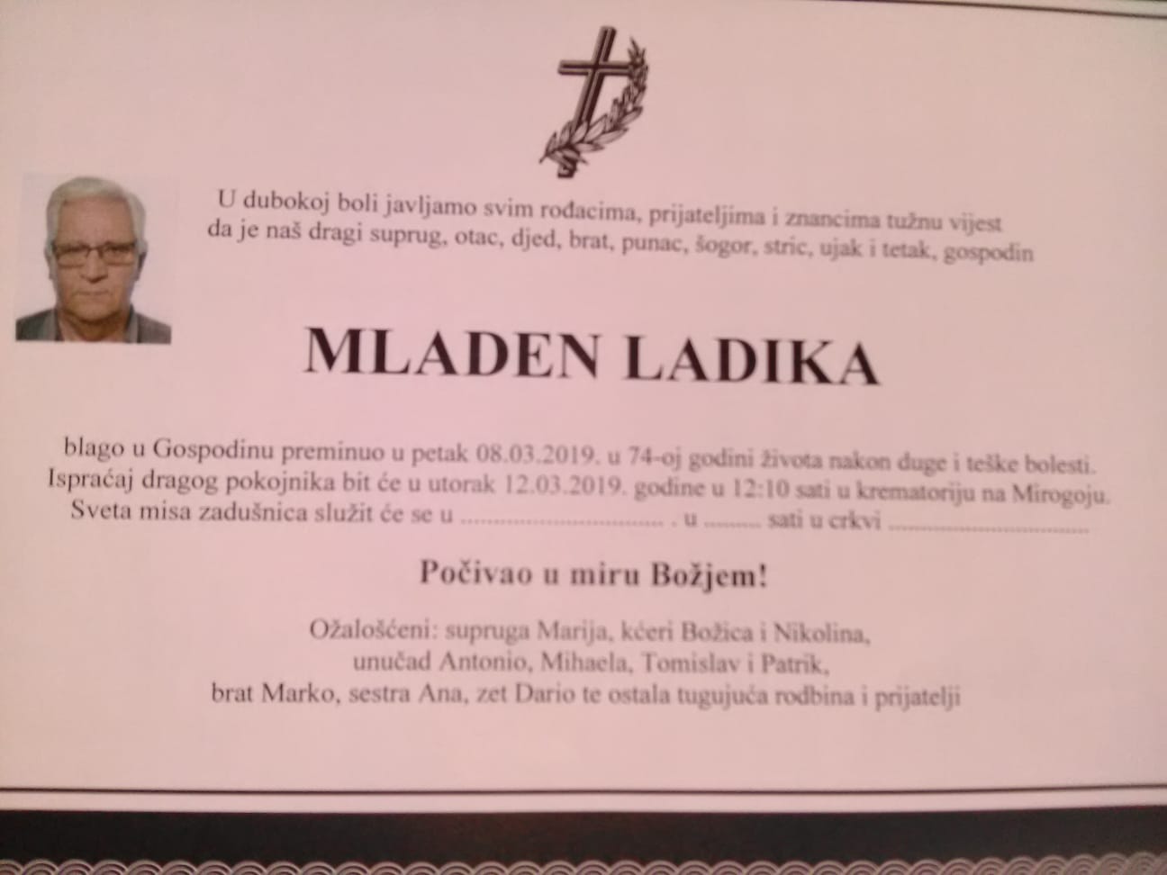 Ispraćaj će biti u utorak 12.03.2019. godine u 12:10h na Krematoriju – Mirogoj.