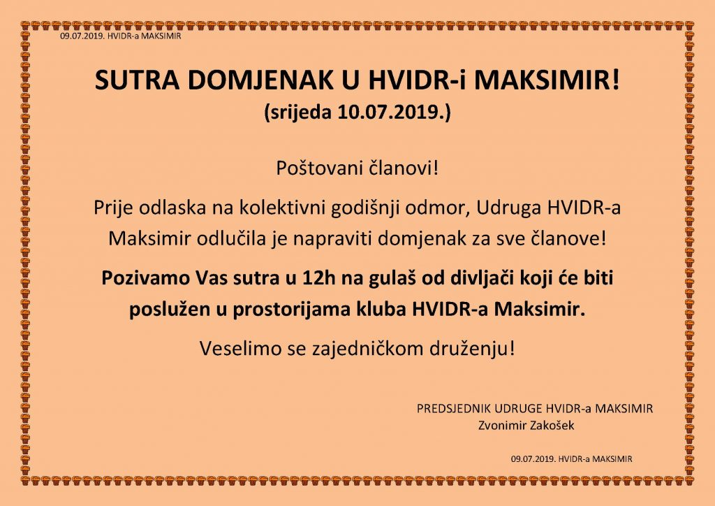 POZIV svim članovima na sutrašnji domjenak u HVIDR-i MAKSIMIR Podijeli Podijeli Facebook Twitter Google +