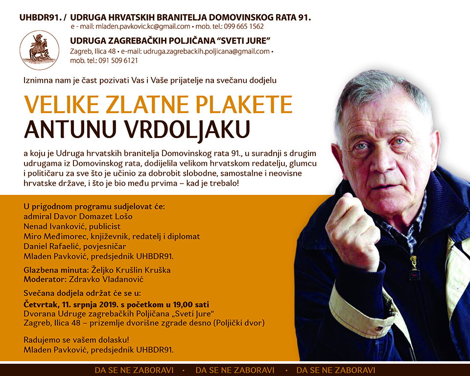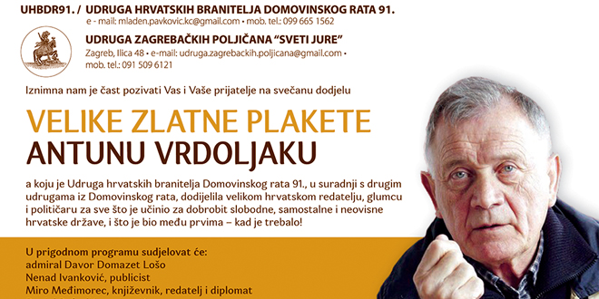 Iznimna nam je čast pozivati Vas i Vaše prijatelje na svečanu dodjelu VELIKE ZLATNE PLAKETE ANTUNU VRDOLJAKU a koju je Udruga hrvatskih branitelja Domovinskog rata 91., u suradnji s drugim udrugama iz Domovinskog rata, dodijelila velikom hrvatskom redatelju, glumcu i političaru za sve što je učinio za dobrobit slobodne, samostalne i neovisne hrvatske države, i što je bio među prvima – kad je trebalo!