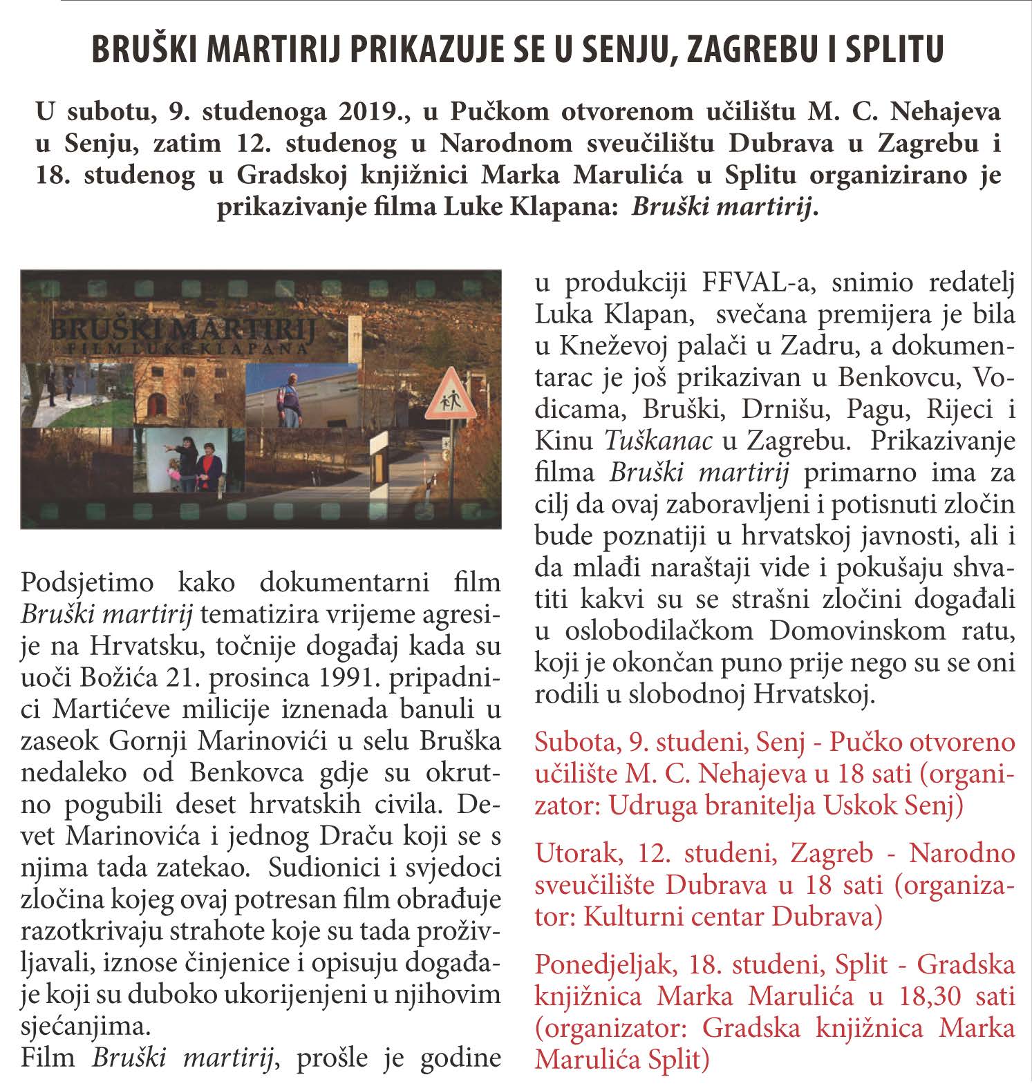 U subotu, 9. studenog 2019., u Pučkom otvorenom učilištu M. C. Nehajeva u Senju, zatim 12. studenog u Narodnom sveučilištu Dubrava u Zagrebu i 18. studenog u Gradskoj knjižnici Marka Marulića u Splitu organizirano je prikazivanje filma Luke Klapana:  Bruški martirij.